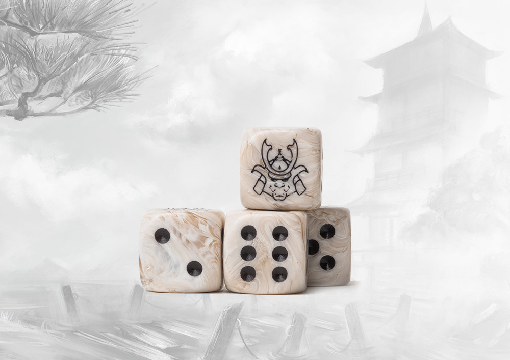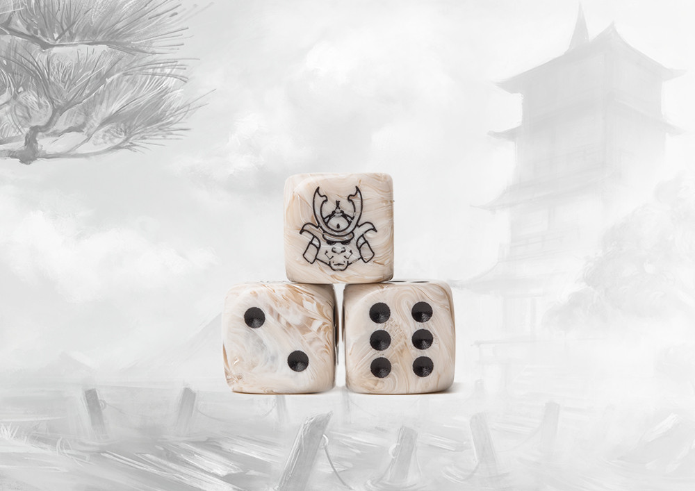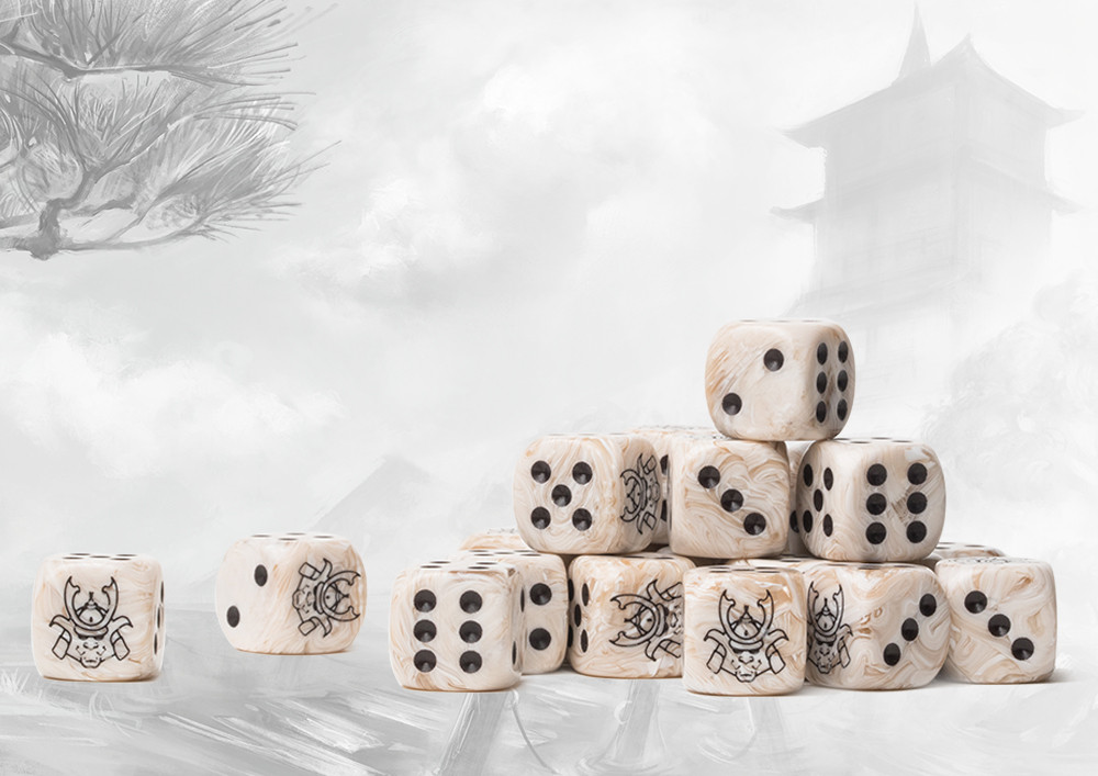These contain a mixture of marbled ancient tans and beige to create a parchment look and inlaid with an easily readable black pips. Pack of 24 resin 16mm dice. The Yoroni symbol replaces the ONE side. Made in the EU.