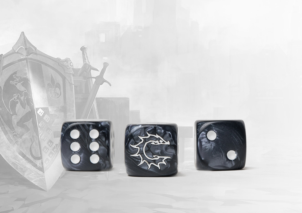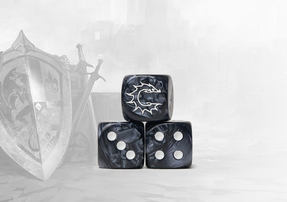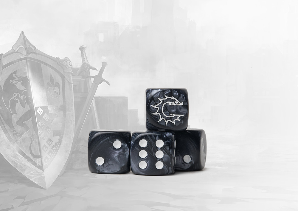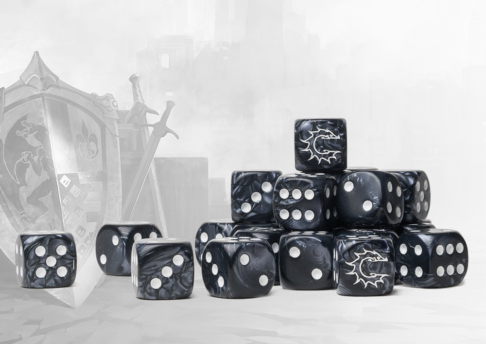 These contain a mixture of marbled ancient greys and inlaid with an easily readable white pips. Pack of 24 resin 16mm dice. The Conquest symbol replaces the ONE side. Made in the EU.