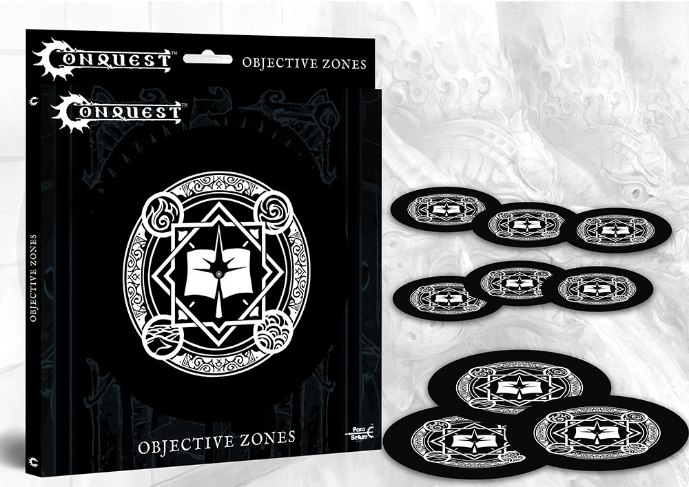 This is a set of 9 Objective Zones in Black with the White Sorcerer Kings Faction Logo that brings more Conquest look and feel to your table. A new and unique material that won’t slip on the table, but will allow your models to easily slide over, off and around, these are ultra thin made of .5mm polypropylene. Great for any wargame play. Three 9″ Zones and Six 6″ Zones packaged together. Made in the EU.