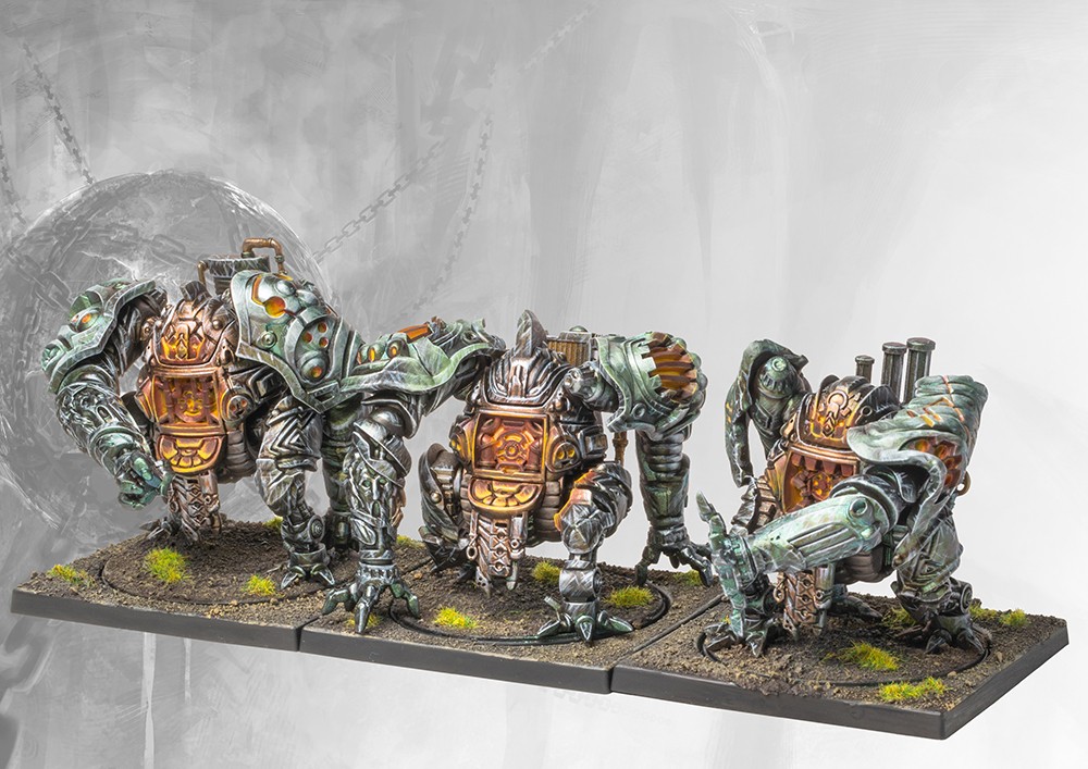 Some Dweghom manifest so much of their Elemental Gift, they must master it or be consumed by it. Few Have the skill, will or dedication needed to become Sorcerers. In fact, most Dweghom elect to install techno sorcerous grafts that allow them to harmlessly vent their excess power. Steelforged pilots are recruited from amongst these individuals who possess a Gift for both Elements: their excess Primordial Fire and Earth channeled through their grafts and into these towering steel automata. Countless foes have been cut down expecting a lumbering clanking behemoth, only to be confounded by the speed and power of these deadly automata.