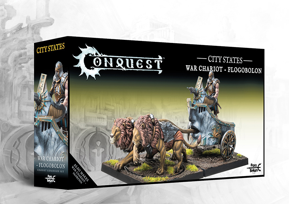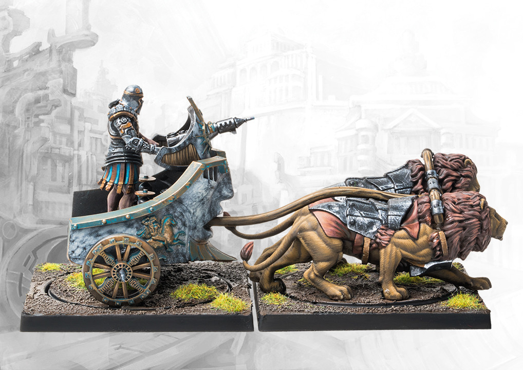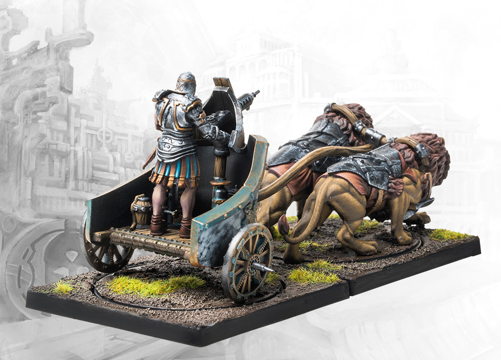 While the effectiveness of the Flogobolon and the Skorpios have long been known to the City States, they have long struggled to find a way to deploy them on the battlefield in a cost effective way. In a stroke of pure genius, the Gerousia of Helias invited the merchant and noble houses to sponsor the construction of these deadly vehicles. The frenzy of spending and overengineering that followed has since then spread to the other City States and their noble patrons. The weapons themselves are a marvel of engineering which nobody but the Dweghom could hope to match, the chariot bodies are crafted of sturdy wood and sheathed metal to keep both rider and weapon from harm… The lions are there simply to proclaim the wealth and power of their patrons.