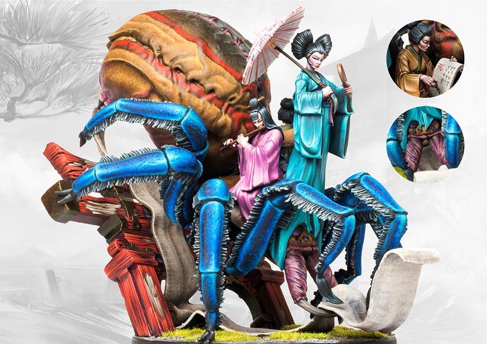 Jorogumo are creatures of mystery even among the Yoroni. Some claim them to be kin to the Kitsune and point to their refinement and beauty and power over dreams and song. Others believe them to be Yoroni attuned to Earth and Water; a confluence that creates the para element of poison and explains their exalted nature. Others still believe them to be amongst the most Enlightened of Yoroni, capable of discerning reality for what it really is, a web of dream and illusion woven by Balance to keep Destruction asleep who have allied with the spirits that perform the weaving itself. Whatever the case might be, none can deny their power, whether it be the entrancing performance of the Geisha or the reality altering sorcery of the Mahotsu. Especially when combined with the terrifying power of of their mount (or is it their body?). Either way, these creatures are a dream to fight alongside and a nightmare to face on the battlefield.
