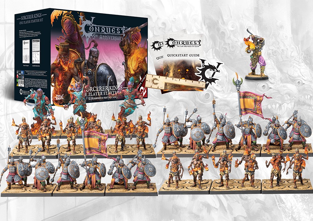 A supercharged 1 player starter ready to play a game of First Blood or The Last Argument of Kings for Conquest’s 8th Faction. This Sorcerer Kings set is loaded with a complete stand of 3 Efreet Brutes, 2 stands of Ghols and 2 stands of Rajakur, and the Raj character. Each starter set will have a well built First Blood army as well as a great beginning set to play a game of Last Argument of Kings. Included in this set are quick start guides for First Blood II and TLAOK II, along with all assembly instructions, a great path of Conquest guide, a 5th Anniversary Decal and Measuring Tool, an EA Paper Map and all necessary command cards, bases and stands. A great value for players, a substantial discount over the prices if purchased separately.