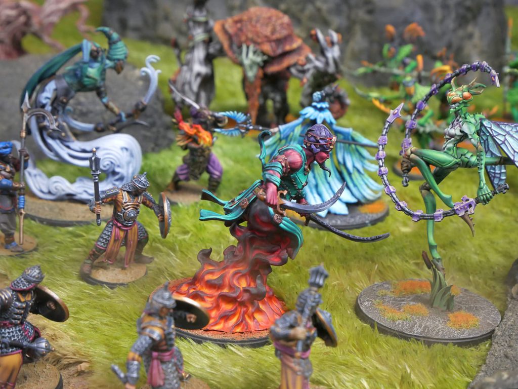 With sword and sorcery, a Raj leads his warband with esoteric might. Rajakur shieldguard their commander as mystical Mahabharati Initiates take down the enemy with elementally imbued strikes. Swirling into battle, the flaming fury of an Efreet Sword Dancer and the slicing wind-piercing arrows of a Windborne Djinn overpower the foe in an awesome display of elemental power.