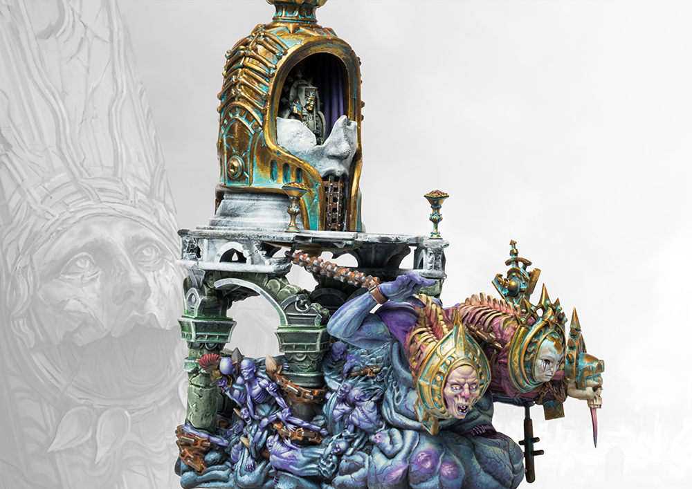 Every Cathedral, Basilica and place of worship of note in the Old Dominion was built by the forefathers of the Tectons with full awareness on the nature of Divinity and the power of Belief. Deep in the bowels of each of these buildings existed a spark of Divinity, held in abeyance until such time as the Pantheon needed a source of power, or a new Divinity. It was in this vulnerable, embryonic stage that many seeds of Divinity were exposed to the baleful energies of the UnGod after the Fall. Now little more than mewling masses of unrequited necromantic potential, these baleful entities are bound to their places of worship. To overcome this limitation, the Final Creed has learnt to pare away the construction, reducing it in size until the unborn godling trapped within is capable of dragging it. Tapping into its essence with little regard for its own survival the clergy of the pantheon uses the corrupted divine power within these hapless beings to empower its troops with corrupted miracles on the battlefield.