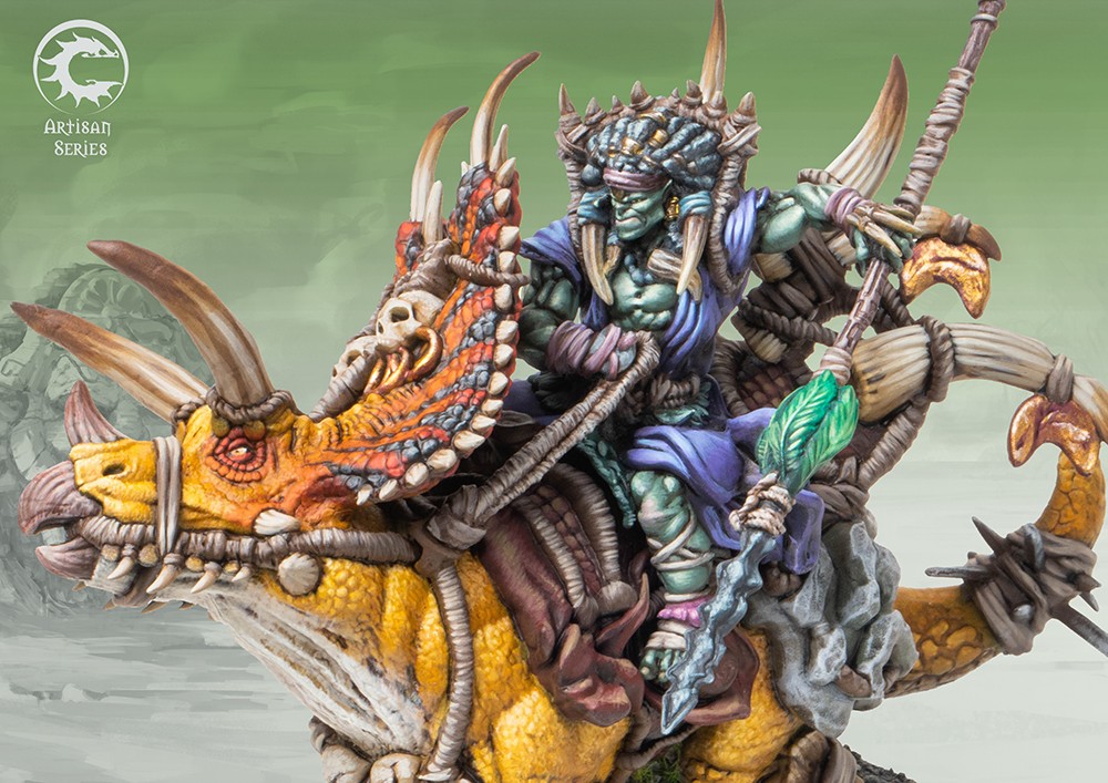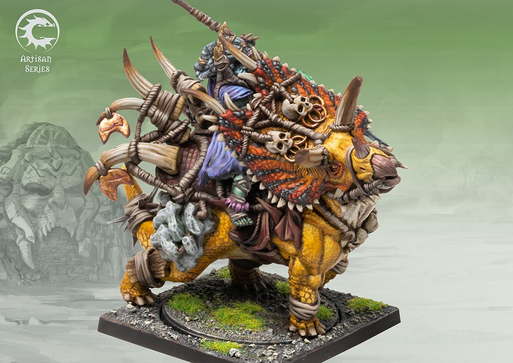 This figure was sculpted and designed by the team at Para-Bellum in keeping with our aesthetic, and created as a larger resin model befitting of our Artisan Series. This is a true artisan series miniature, with incredible details that make it a presence on a game table, or as a painted model. As the W’adrhŭn hosts thunders into battle, it is not uncommon for its leaders to lead from the vanguard. While it has been established that male W’adrhŭn struggle to form stable bonds with carnivorous dinosaurs, this poses no impediment to those who would seek to bond and ride a Ceratopsian dinosaur. Mounted atop this formidable beast, the Thunder Chieftain becomes a bastion of prowess and rallying point upon the battlefield, the ungainly and brutal nature of his mount’s attacks is more than offset by the sheer combat prowess displayed by the greatest warrior in the tribe.