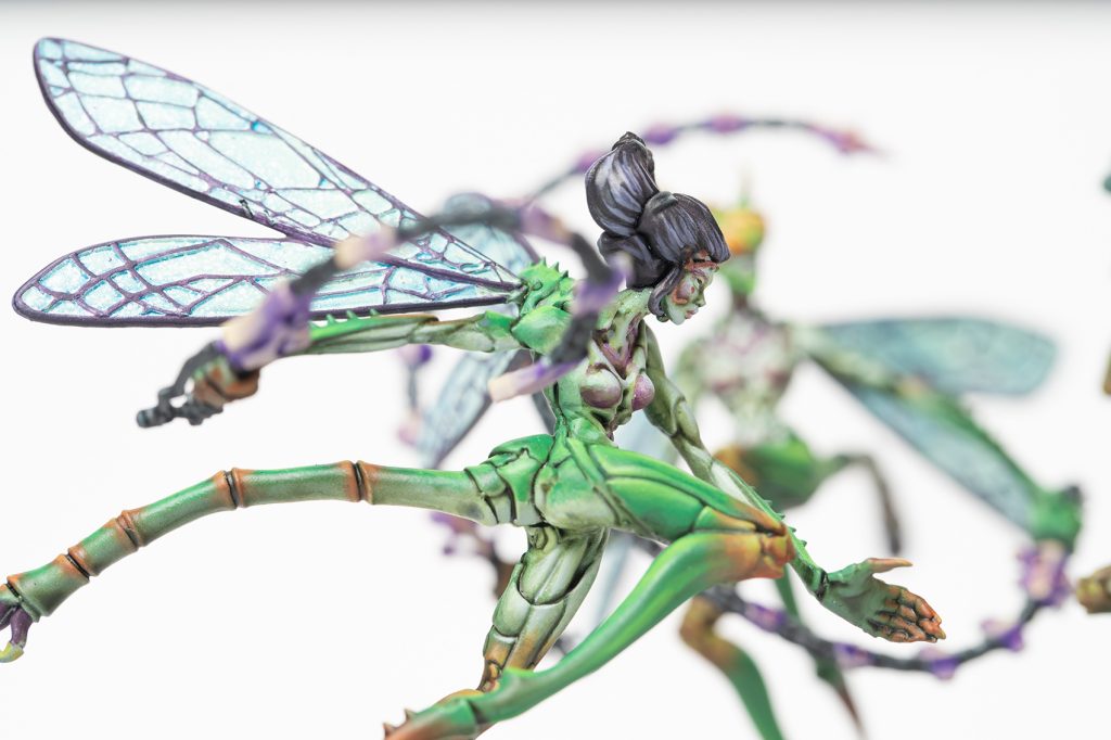 Among the myriad forms of war and violence that can be found within the Court of Summer, Scaile Dancers stand out as the most beautiful… and deadly. Their iridescent wings, compound eyes, preternatural reflexes and whip-like swords meld into a deadly display of acrobatic prowess, making it look like they dance among their foes, rather than fight. The trail of red ruin they leave in their wake belies this illusion.